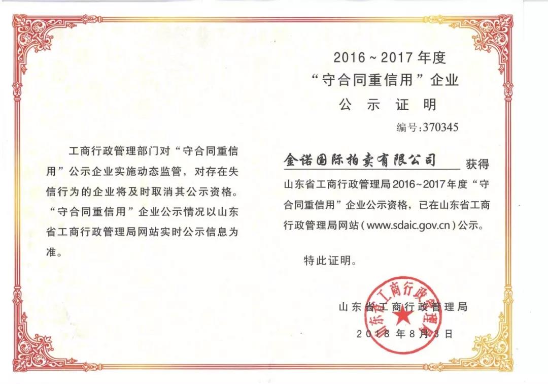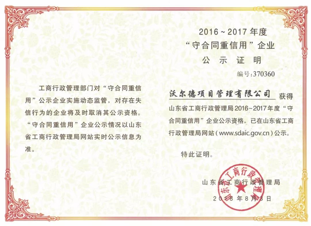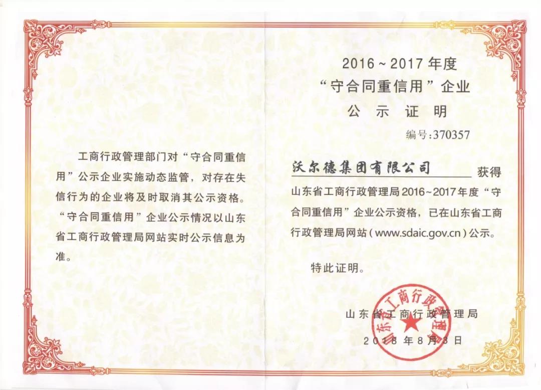 經山東省工商行政管理局的專項評選,沃爾德集團有限公司、金諾國際拍賣有限公司、沃爾德項目管理有限公司喜獲2016-2017年度山東省“守合同重信用”企業的榮譽稱號,并于近日領取了公示證明。